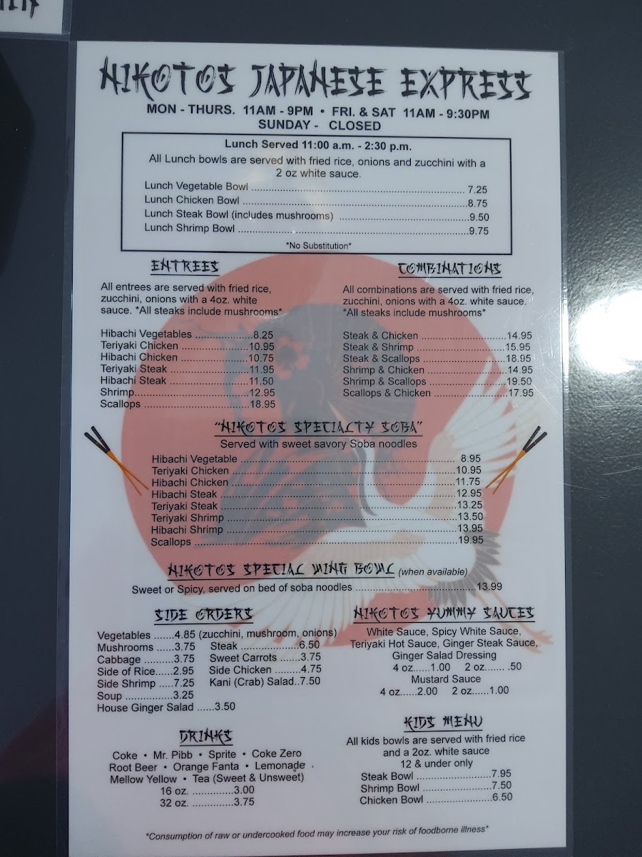 The Nikotos Japanese Express Menu offers the kind of comfort food you go back for without even thinking twice. Tucked over on 1417 S 1st St in Jesup, this spot keeps things simple in the best way, starting with generous portions and familiar flavors that hit the table fast. As you look through the menu, you’ll notice how easy it is to mix and match-whether you’re craving a plate loaded with hibachi chicken and veggies or leaning toward something a little richer like their steak or shrimp combos.